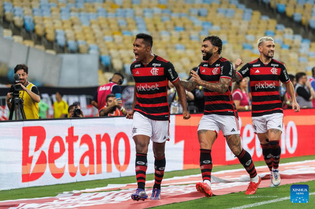 RIO DE JANEIRO, 3 octubre, 2024 (Xinhua) -- Imagen del 2 de octubre de 2024 del jugador Alex Sandro (i), de Flamengo, festejando su anotación junto a sus compañeros, Gabi (i) y Giorgian De Arrascaeta (d),durante el partido de ida correspondiente a la semifinal de la Copa de Brasil, ante Corinthians, celebrado en el Estadio Maracaná, en Río de Janeiro, Brasil. (Xinhua/Claudia Martini)