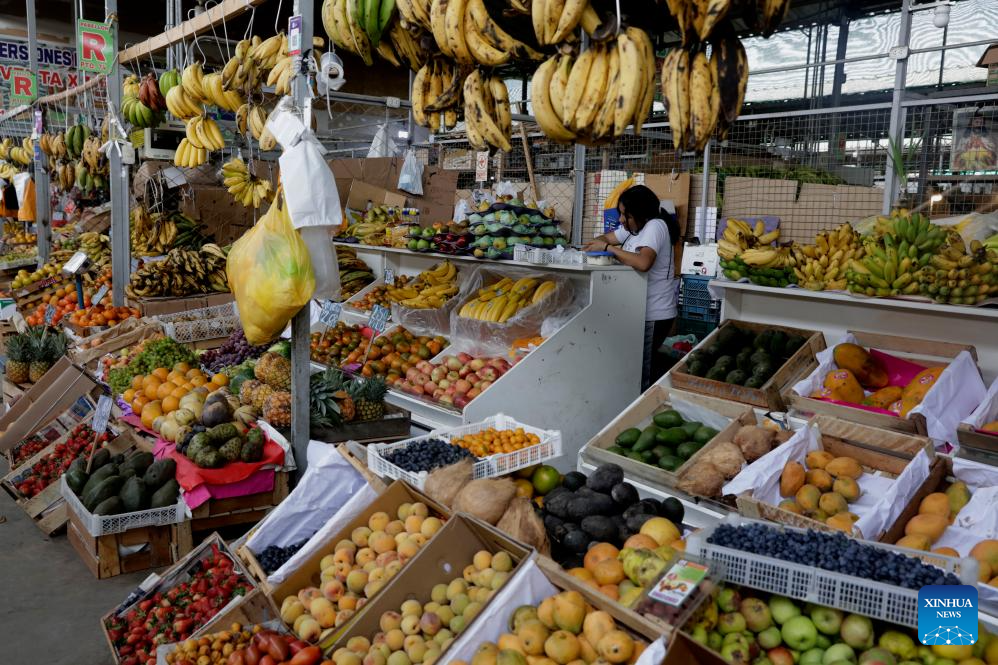 LIMA, 3 octubre, 2024 (Xinhua) -- Imagen del 2 de octubre de 2024 de una vendedora de fruta esperando por clientes en un puesto del mercado Bambú, en el distrito de Lurín, en Lima, Perú. (Xinhua/Mariana Bazo)