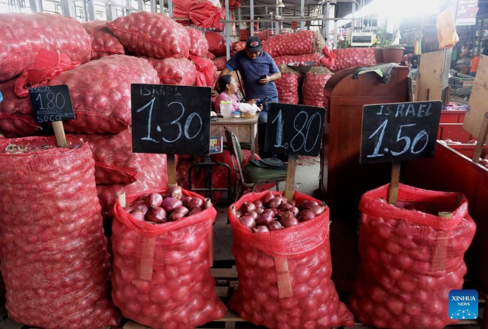 LIMA, 3 octubre, 2024 (Xinhua) -- Imagen del 2 de octubre de 2024 de vendedores de cebollas esperando por clientes en un puesto del mercado Bambú, en el distrito de Lurín, en Lima, Perú. (Xinhua/Mariana Bazo)