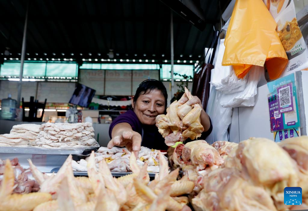 LIMA, 3 octubre, 2024 (Xinhua) -- Imagen del 2 de octubre de 2024 de una vendedora de pollo acomodando sus productos en un puesto del mercado Bambú, en el distrito de Lurín, en Lima, Perú. (Xinhua/Mariana Bazo)