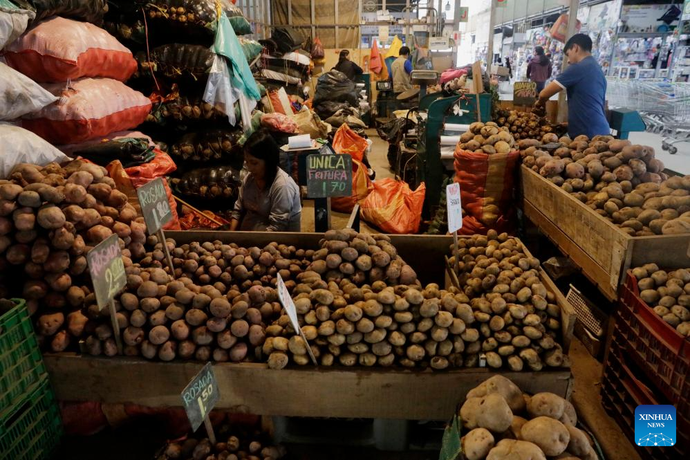 LIMA, 3 octubre, 2024 (Xinhua) -- Imagen del 2 de octubre de 2024 de vendedores de papas acomodando sus productos en un puesto del mercado Bambú, en el distrito de Lurín, en Lima, Perú. (Xinhua/Mariana Bazo)