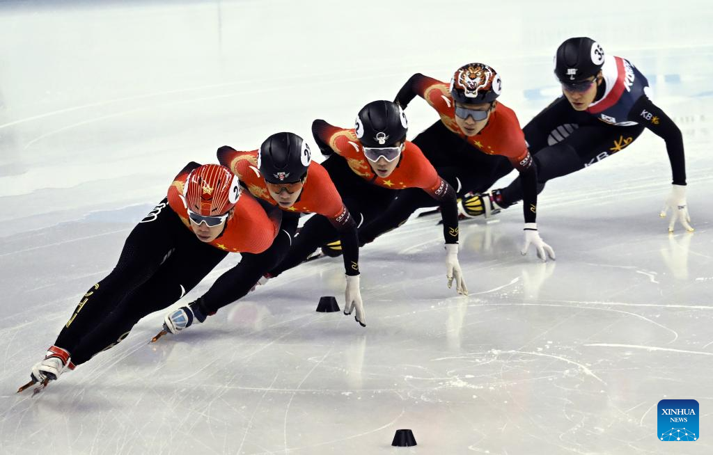 SHANGHAI, 3 octubre, 2024 (Xinhua) -- Atletas compiten durante la Final A masculina de 1000m de patinaje de velocidad en pista corta en el Trofeo de Shanghai 2024, en Shanghai, en el este de China, el 3 de octubre de 2024. (Xinhua/Chen Haoming)