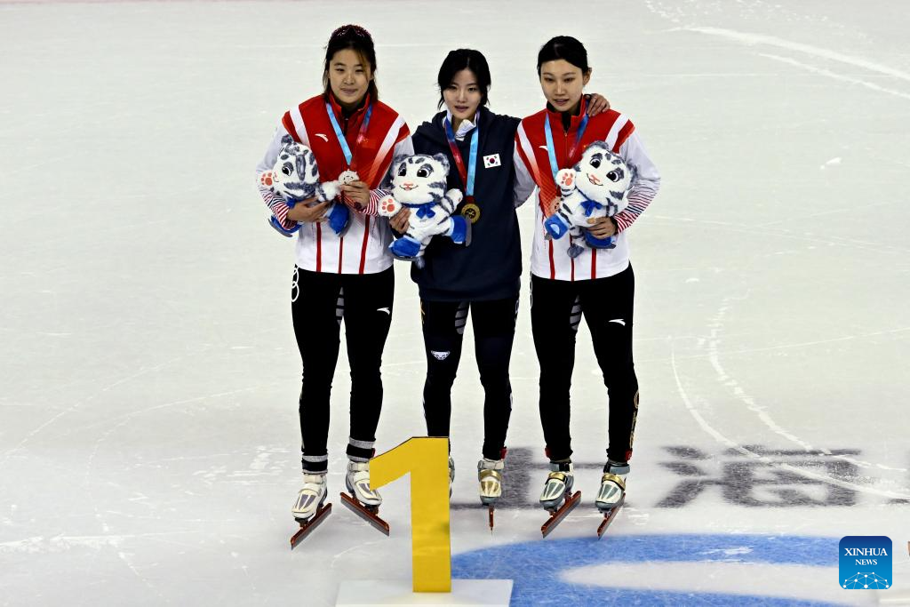 SHANGHAI, 3 octubre, 2024 (Xinhua) -- La medallista de oro Lee Yubin (c), de República de Corea, la medallista de plata Zhang Chutong (i), de China, y la medallista de bronce Zang Yize (d), de China, asisten a la ceremonia de premiación de la Final A femenina de 1000m de patinaje de velocidad en pista corta en el Trofeo de Shanghai 2024, en Shanghai, en el este de China, el 3 de octubre de 2024. (Xinhua/Chen Haoming)