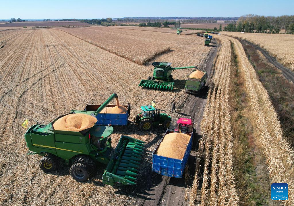BEIJING, 4 octubre, 2024 (Xinhua) -- Vista aérea tomada con un dron el 1 de octubre de 2024 de máquinas agrícolas cosechando maíz en una granja del Grupo Beidahuang, en la provincia de Heilongjiang, en el noreste de China. (Xinhua/Xu Yingxian)