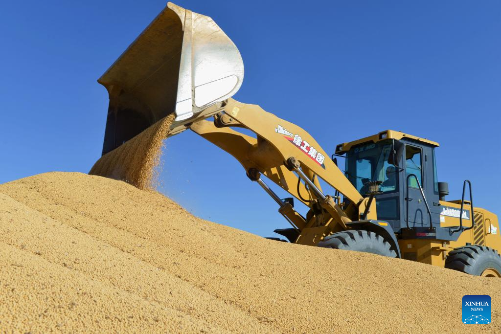 BEIJING, 4 octubre, 2024 (Xinhua) -- Imagen del 3 de octubre de 2024 de una pala cargadora trasladando soja en una granja del Grupo Beidahuang, en la provincia de Heilongjiang, en el noreste de China. (Xinhua/Qian Boyu)