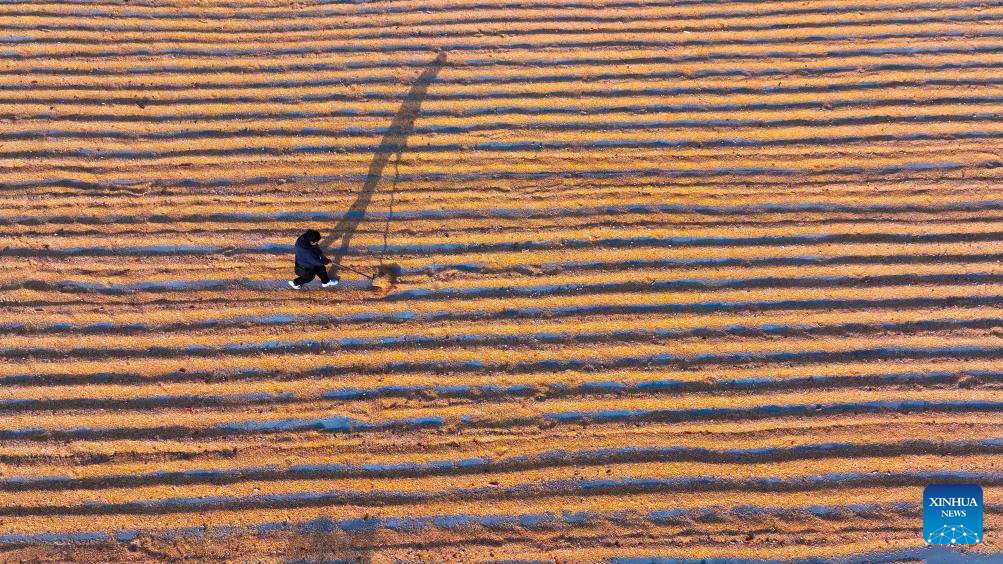 BEIJING, 4 octubre, 2024 (Xinhua) -- Vista aérea tomada con un dron el 4 de octubre de 2024 de un agricultor secando maíz, en la aldea Dongxinzhuang de la ciudad de Zunhua, en la provincia de Hebei, en el norte de China. (Xinhua/Liu Mancang)