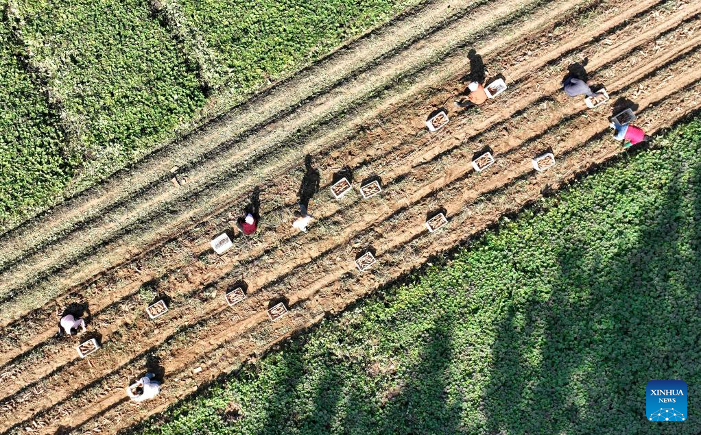 BEIJING, 4 octubre, 2024 (Xinhua) -- Vista aérea tomada con un dron el 4 de octubre de 2024 de agricultores cosechando batatas, en la aldea Houduanzhai del distrito de Qiuxian, en la provincia de Hebei, en el norte de China. (Xinhua/Wang Xiao)