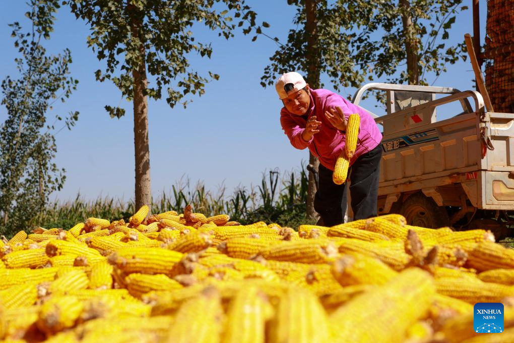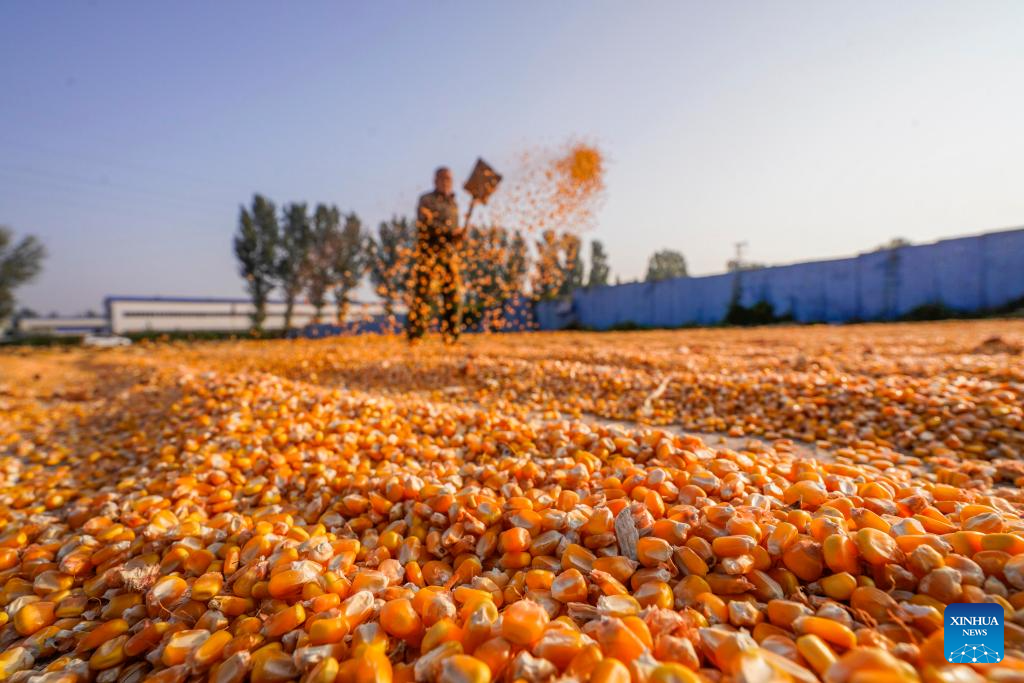 BEIJING, 4 octubre, 2024 (Xinhua) -- Un agricultor seca el maíz, en la aldea Dongxinzhuang de la ciudad de Zunhua, en la provincia de Hebei, en el norte de China, el 4 de octubre de 2024. (Xinhua/Liu Mancang)