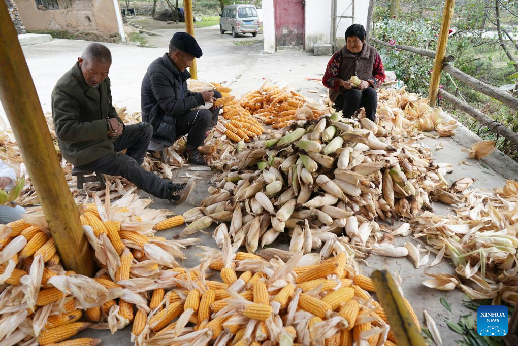 BEIJING, 4 octubre, 2024 (Xinhua) -- Imagen del 1 de octubre de 2024 de agricultores desgranando maíz, en la aldea Kuyuhe del distrito de Chang'an, en la ciudad de Xi'an, en la provincia de Shaanxi, en el noroeste de China. (Xinhua/Shao Rui)