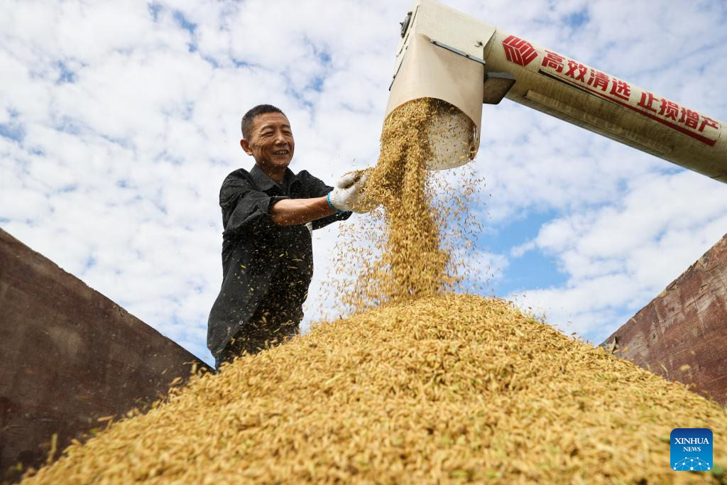 BEIJING, 4 octubre, 2024 (Xinhua) -- Un agricultor revisa el arroz recién cosechado, en la aldea de Shangqiang del distrito de Wuxing, en la ciudad de Huzhou, en la provincia de Zhejiang, en el este de China, el 4 de octubre de 2024. (Xinhua/He Weiwei)