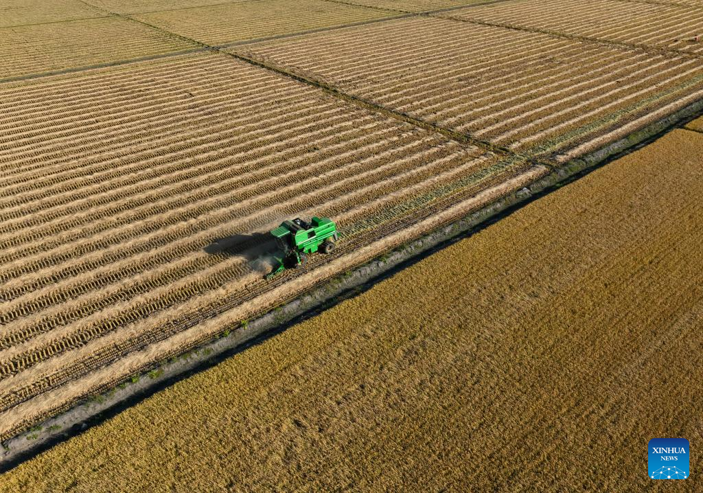 BEIJING, 4 octubre, 2024 (Xinhua) -- Vista aérea tomada con un dron el 3 de octubre de 2024 de una cosechadora trabajando en los arrozales en una granja del Grupo Beidahuang, en la provincia de Heilongjiang, en el noreste de China. (Xinhua/Dang Aihe)
