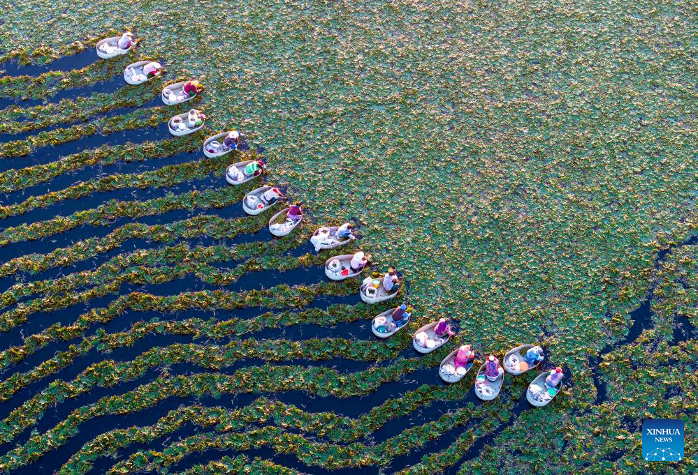 BEIJING, 4 octubre, 2024 (Xinhua) -- Vista aérea tomada con un dron el 4 de octubre de 2024 de agricultores recolectando abrojos de agua, en el poblado de Suchen del distrito de Hailing, en la ciudad de Taizhou, en la provincia de Jiangsu, en el este de China. (Xinhua/Tang Dehong)