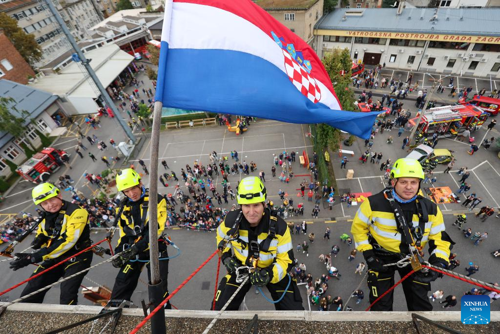 ZAGREB, 5 octubre, 2024 (Xinhua) -- Cuatro bomberos muestran sus habilidades de descenso con motivo del Día de Puertas Abiertas de los Bomberos llevado a cabo por el departamento público de bomberos de Zagreb, en Zagreb, Croacia, el 5 de octubre de 2024. (Xinhua/Sanjin Strukic/PIXSELL)