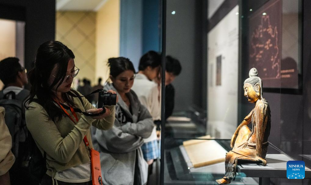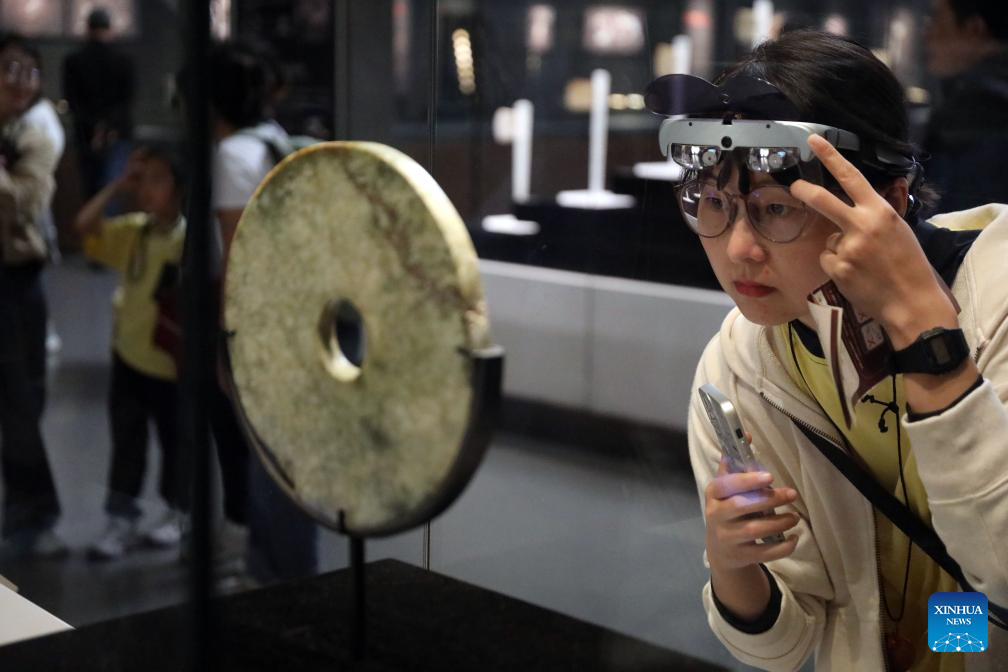 BEIJING, 5 octubre, 2024 (Xinhua) -- Una turista visita una exposición en el Museo de Liangzhu, en Hangzhou, capital de la provincia de Zhejiang, en el este de China, el 5 de octubre de 2024. Durante la semana de vacaciones con motivo del Día Nacional que comenza el 1 de octubre, muchos chinos realizan recorridos culturales para conocer y apreciar la cultura tradicional china. (Xinhua/Xu Junyong)
