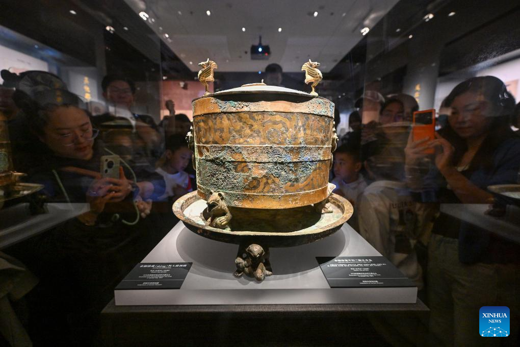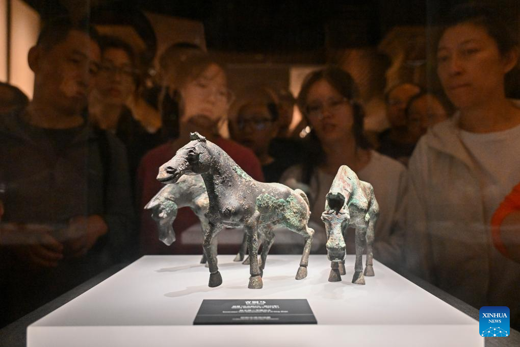 BEIJING, 5 octubre, 2024 (Xinhua) -- Turistas observan caballos de bronce del Período de los Reinos Combatientes (475 a.C.-221 a.C.) en el Museo de Handan, en Handan, en la provincia de Hebei, en el norte de China, el 5 de octubre de 2024. Durante la semana de vacaciones con motivo del Día Nacional que comenza el 1 de octubre, muchos chinos realizan recorridos culturales para conocer y apreciar la cultura tradicional china. (Xinhua/Li Xin)