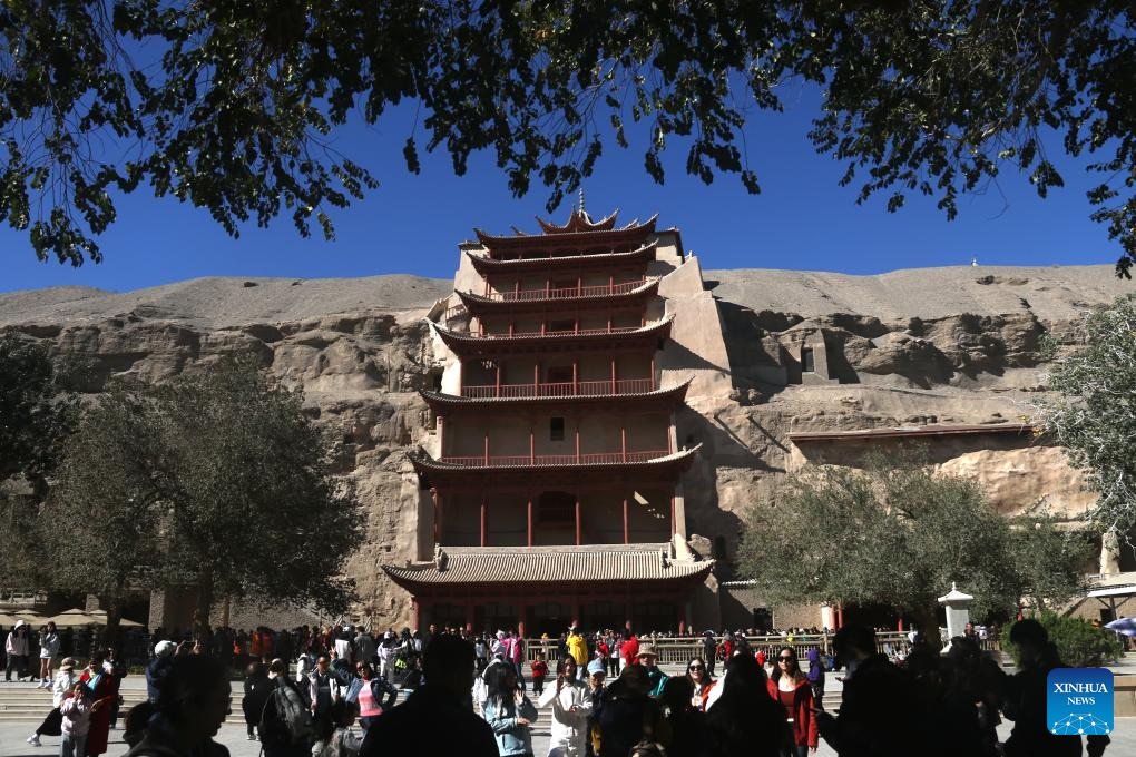BEIJING, 5 octubre, 2024 (Xinhua) -- Imagen del 2 de octubre de 2024 de turistas visitando las Grutas de Mogao, en Dunhuang, en la provincia de Gansu, en el noroeste de China. Durante la semana de vacaciones con motivo del Día Nacional que comenza el 1 de octubre, muchos chinos realizan recorridos culturales para conocer y apreciar la cultura tradicional china. (Xinhua/Zhang Xiaoliang)