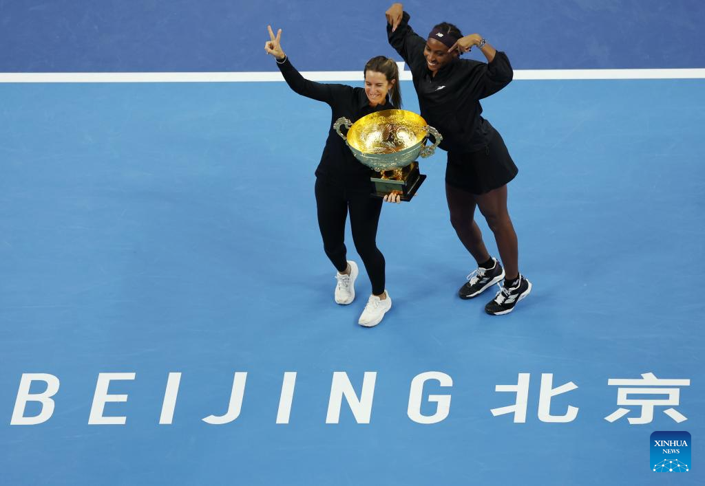 BEIJING, 6 octubre, 2024 (Xinhua) -- La ganadora Coco Gauff (d), de Estados Unidos, festeja con su trofeo después de ganar el partido final de individuales femeninos ante Karolina Muchova, de República Checa, en el torneo de tenis Abierto de China 2024, en Beijing, China, el 6 de octubre de 2024. (Xinhua/Zhang Chenlin)