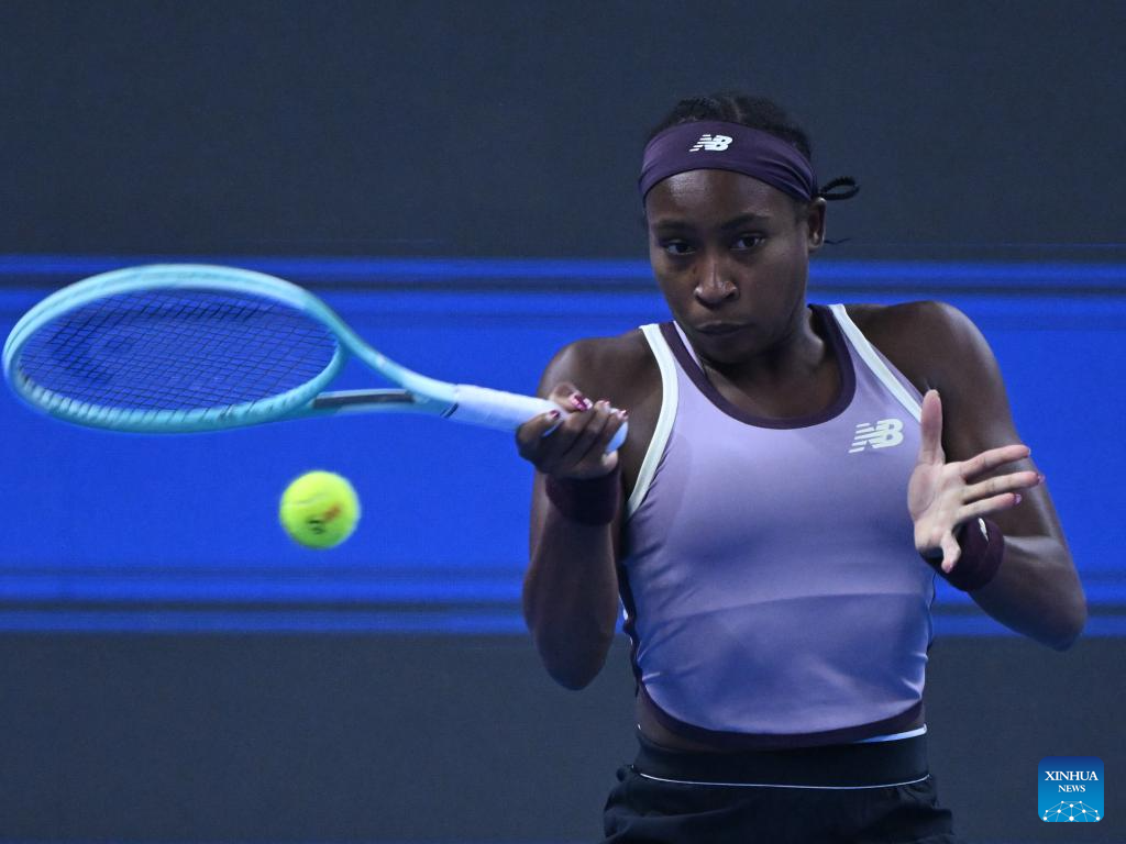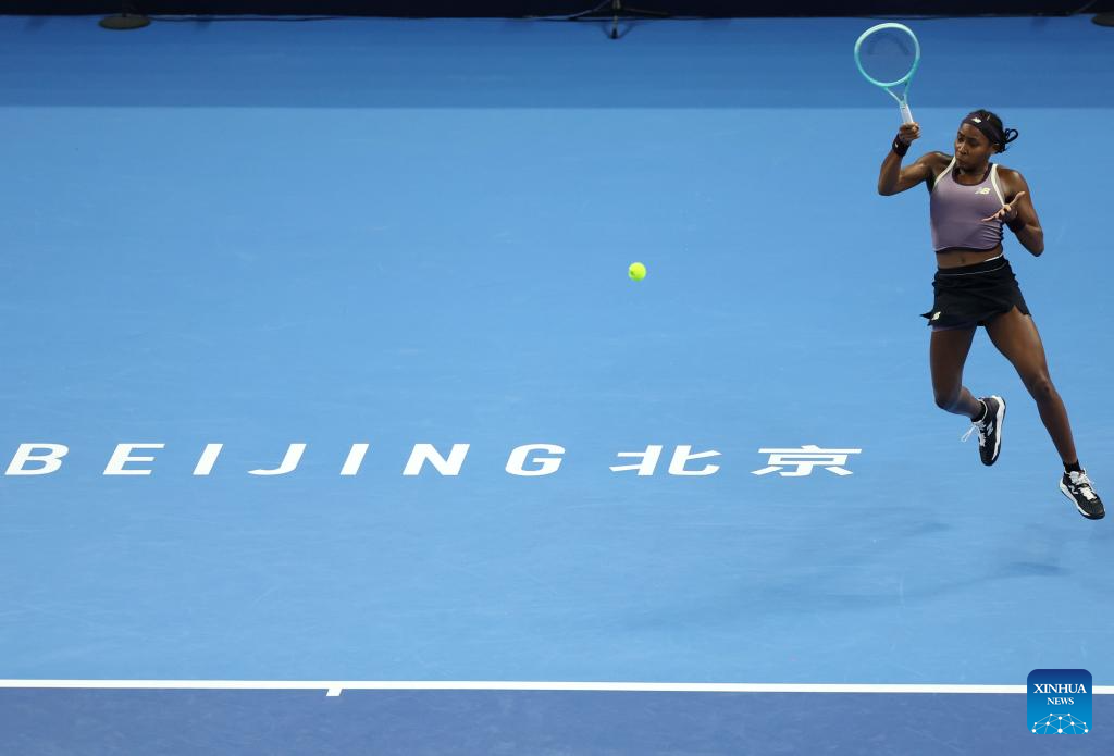 BEIJING, 6 octubre, 2024 (Xinhua) -- Coco Gauff, de Estados Unidos, devuelve la pelota durante el partido final de individuales femeninos ante Karolina Muchova, de República Checa, en el torneo de tenis Abierto de China 2024, en Beijing, China, el 6 de octubre de 2024. (Xinhua/Zhang Chenlin)