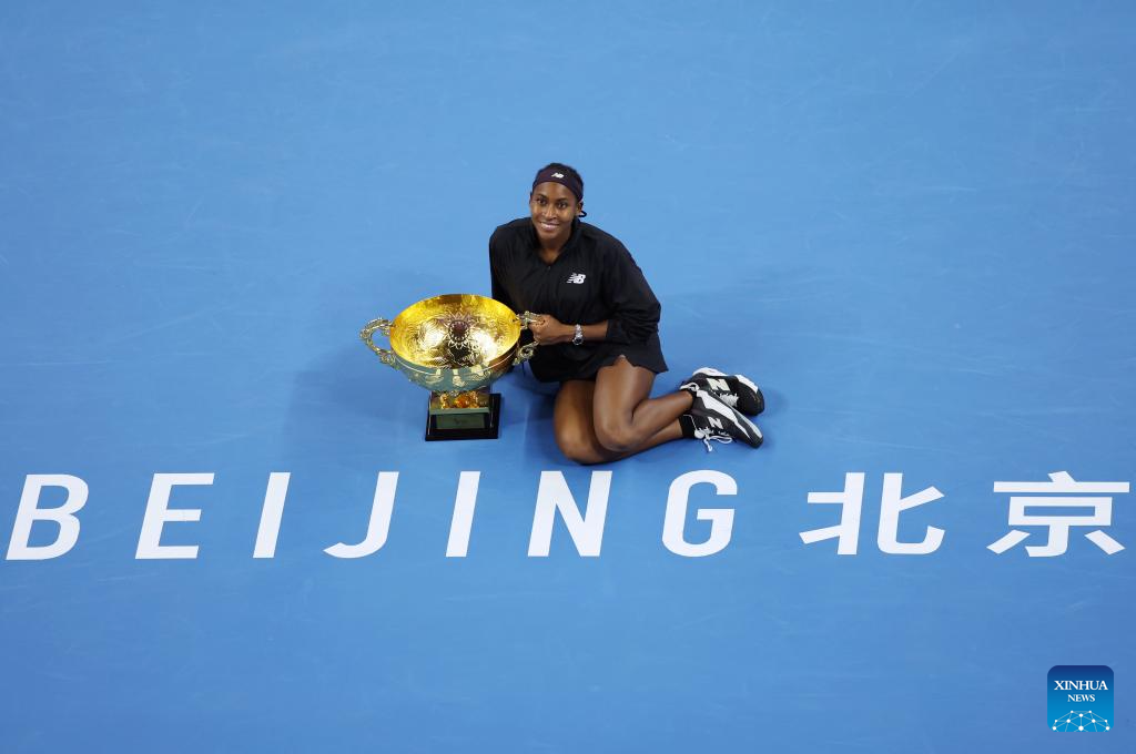 BEIJING, 6 octubre, 2024 (Xinhua) -- La ganadora Coco Gauff, de Estados Unidos, posa con su trofeo después de ganar el partido final de individuales femeninos ante Karolina Muchova, de República Checa, en el torneo de tenis Abierto de China 2024, en Beijing, China, el 6 de octubre de 2024. (Xinhua/Zhang Chenlin)