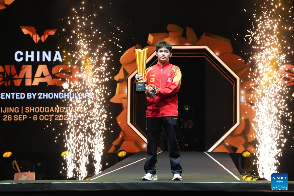 BEIJING, 6 octubre, 2024 (Xinhua) -- El ganador Lin Shidong, de China, posa con su trofeo durante la ceremonia de premiación para el partido final de individuales masculinos, en el China Smash del World Table Tennis (WTT) 2024, en Beijing, China, el 6 de octubre de 2024. (Xinhua/Ju Huanzong)