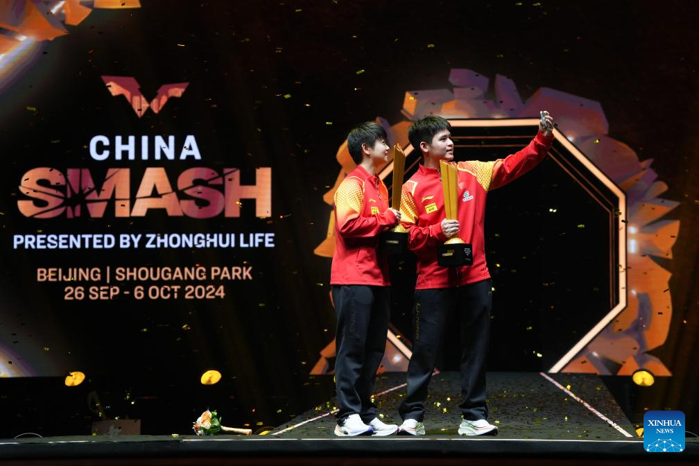 BEIJING, 6 octubre, 2024 (Xinhua) -- El ganador de individuales masculinos, Lin Shidong (d), de China, y la ganadora de individuales femeninos, Sun Yingsha, de China, se toman fotografías durante el China Smash del World Table Tennis (WTT) 2024, en Beijing, China, el 6 de octubre de 2024. (Xinhua/Ju Huanzong)