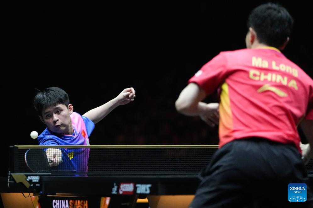 BEIJING, 6 octubre, 2024 (Xinhua) -- Lin Shidong (i), de China, devuelve la pelota durante el partido final de individuales masculinos ante Ma Long, de China, en el China Smash del World Table Tennis (WTT) 2024, en Beijing, China, el 6 de octubre de 2024. (Xinhua/Ju Huanzong)