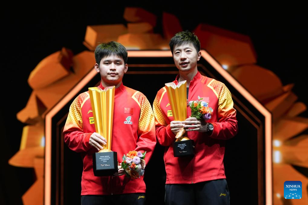 BEIJING, 6 octubre, 2024 (Xinhua) -- El ganador Lin Shidong (i), de China, y el segundo lugar Ma Long, de China, posan durante la ceremonia de premiación para el partido final de individuales masculinos, en el China Smash del World Table Tennis (WTT) 2024, en Beijing, China, el 6 de octubre de 2024. (Xinhua/Ju Huanzong)