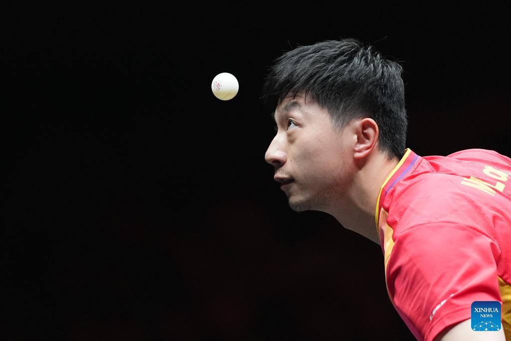 BEIJING, 6 octubre, 2024 (Xinhua) -- Ma Long, de China, sirve la pelota durante el partido final de individuales masculinos ante Lin Shidong, de China en el China Smash del World Table Tennis (WTT) 2024, en Beijing, China, el 6 de octubre de 2024. (Xinhua/Ju Huanzong)