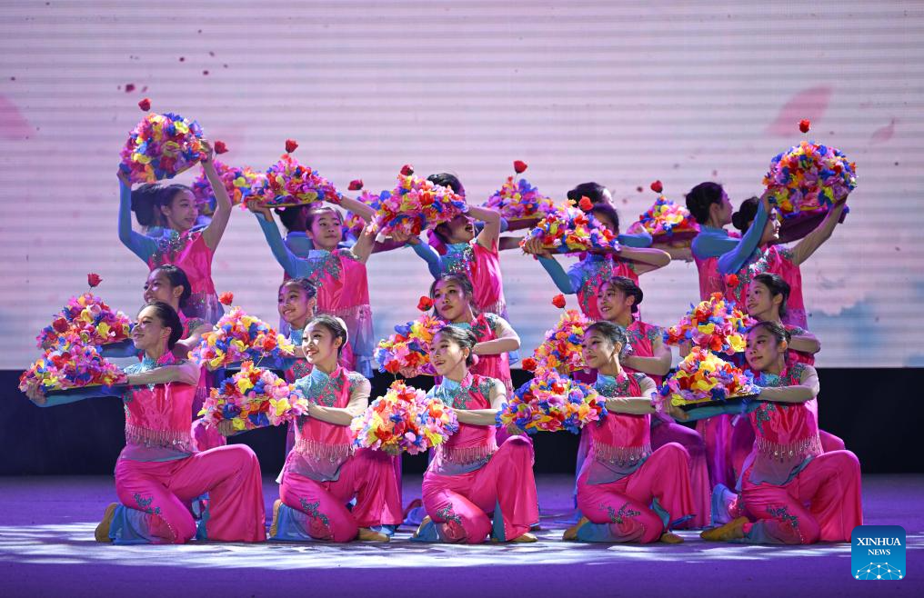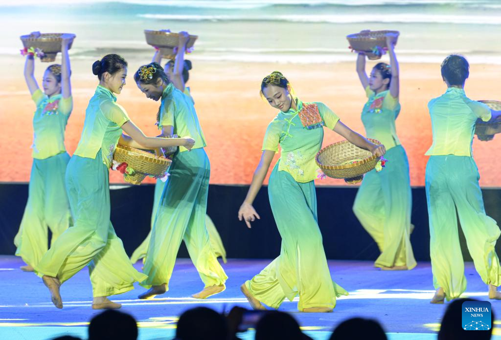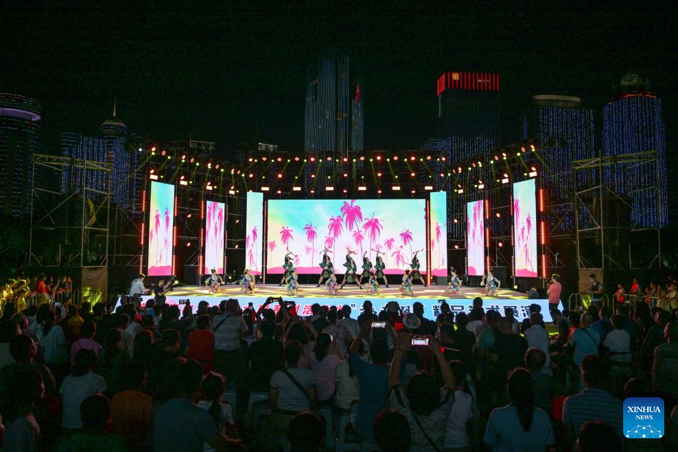HAIKOU, 6 octubre, 2024 (Xinhua) -- Imagen del 5 de octubre de 2024 de actores participando durante una presentación artística en el Parque Evergreen, en Haikou, en la provincia de Hainan, en el sur de China. Como una de las actividades de la primera edición de la Semana de Arte Urbano de Haikou, el sábado por la noche se llevó a cabo una presentación artística con características de Hainan en el Parque Evergreen de Haikou, añadiendo un ambiente festivo a la ciudad durante el feriado del Día Nacional de una semana de duración, que comenzó el 1 de octubre. (Xinhua/Pu Xiaoxu)