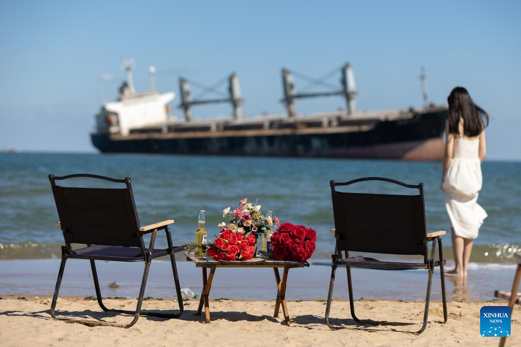 RONGCHENG, 6 octubre, 2024 (Xinhua) -- Imagen del 3 de octubre de 2024 de una turista disfrutando del tiempo libre en la playa, en la ciudad de Rongcheng, en la provincia de Shandong, en el este de China. Durante la semana de vacaciones con motivo del Día Nacional que comienza el 1 de octubre, los chinos se toman un descanso para viajar y disfrutar de actividades de ocio. La creciente y fuerte demanda de las personas por opciones de vacaciones diversificadas ha dado lugar a productos culturales y turísticos más abundantes y diversos en el mercado turístico durante las vacaciones. (Xinhua/Yi Fan)