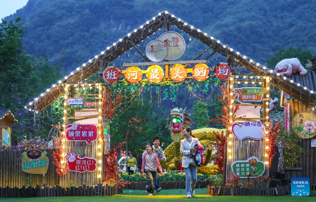 XIANGYANG, 6 octubre, 2024 (Xinhua) -- Imagen del 5 de octubre del 2024 de turistas disfrutando, en la aldea de Dengjiaping de la ciudad de Xiangyang, en la provincia de Hubei, en el centro de China. Durante la semana de vacaciones con motivo del Día Nacional que comienza el 1 de octubre, los chinos se toman un descanso para viajar y disfrutar de actividades de ocio. La creciente y fuerte demanda de las personas por opciones de vacaciones diversificadas ha dado lugar a productos culturales y turísticos más abundantes y diversos en el mercado turístico durante las vacaciones. (Xinhua/Yang Dong)