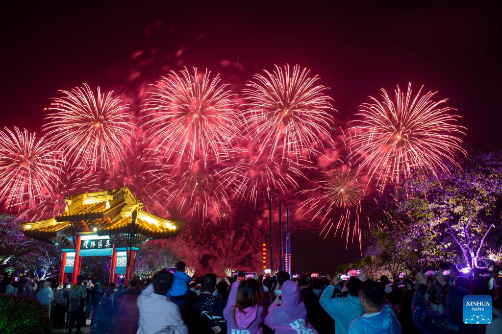 WUXI, 6 octubre, 2024 (Xinhua) -- Imagen del 5 de octubre del 2024 de turistas observando un espectáculo de fuegos artificiales en el punto escénico de Yuantouzhu del lago Taihu, en Wuxi, en la provincia de Jiangsu, en el este de China. Durante la semana de vacaciones con motivo del Día Nacional que comienza el 1 de octubre, los chinos se toman un descanso para viajar y disfrutar de actividades de ocio. La creciente y fuerte demanda de las personas por opciones de vacaciones diversificadas ha dado lugar a productos culturales y turísticos más abundantes y diversos en el mercado turístico durante las vacaciones. (Xinhua/Pan Zhengguang)