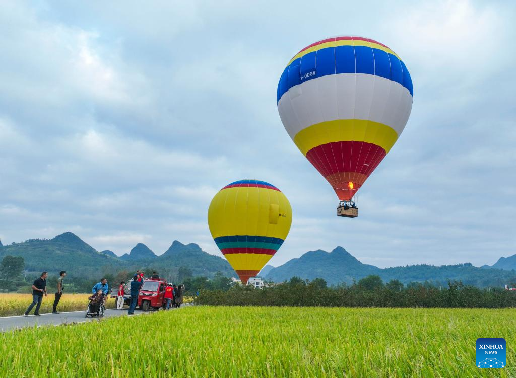 NINGYUAN, 6 octubre, 2024 (Xinhua) -- Imagen tomada con un dron el 6 de octubre de 2024 de turistas tomando globos aerostáticos para hacer recorridos turísticos, en el poblado de Wanjing del distrito de Ningyuan, en la provincia de Hunan, en el centro de China. Durante la semana de vacaciones con motivo del Día Nacional que comienza el 1 de octubre, los chinos se toman un descanso para viajar y disfrutar de actividades de ocio. La creciente y fuerte demanda de las personas por opciones de vacaciones diversificadas ha dado lugar a productos culturales y turísticos más abundantes y diversos en el mercado turístico durante las vacaciones. (Xinhua/Jiang Keqing)