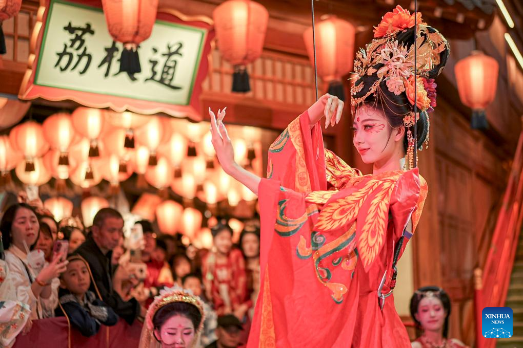 XI'AN, 6 octubre, 2024 (Xinhua) -- Imagen del 2 de octubre de 2024 de una actriz realizando una presentación en un bloque temático, en Xi'an, en la provincia de Shaanxi, en el noroeste de China. Durante la semana de vacaciones con motivo del Día Nacional que comienza el 1 de octubre, los chinos se toman un descanso para viajar y disfrutar de actividades de ocio. La creciente y fuerte demanda de las personas por opciones de vacaciones diversificadas ha dado lugar a productos culturales y turísticos más abundantes y diversos en el mercado turístico durante las vacaciones. (Xinhua)