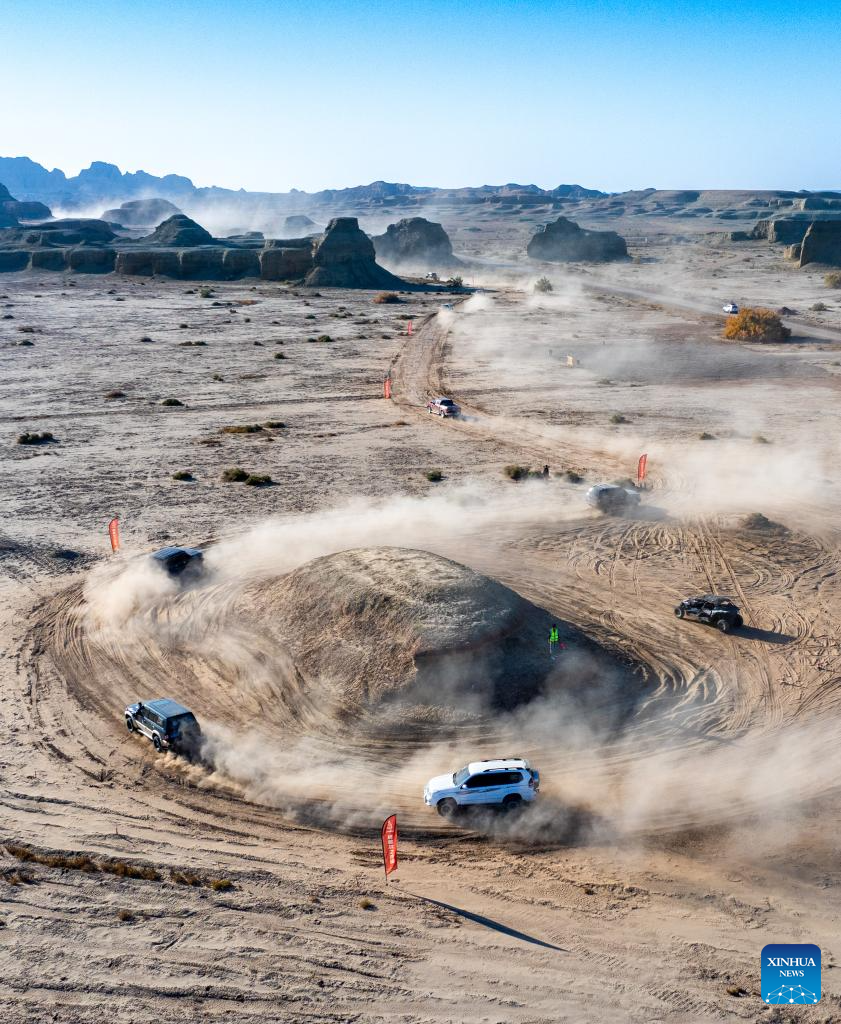 KARAMAY, 6 octubre, 2024 (Xinhua) -- Vista aérea tomada con un dron el 5 de octubre de 2024 de turistas participando en un desafío todoterreno en la Ciudad Misteriosa Mundial de Karamay, en el distrito de Urho de Karamay, en la región autónoma uygur de Xinjiang, en el noroeste de China. Durante la semana de vacaciones con motivo del Día Nacional que comienza el 1 de octubre, los chinos se toman un descanso para viajar y disfrutar de actividades de ocio. La creciente y fuerte demanda de las personas por opciones de vacaciones diversificadas ha dado lugar a productos culturales y turísticos más abundantes y diversos en el mercado turístico durante las vacaciones. (Xinhua/Min Yong)