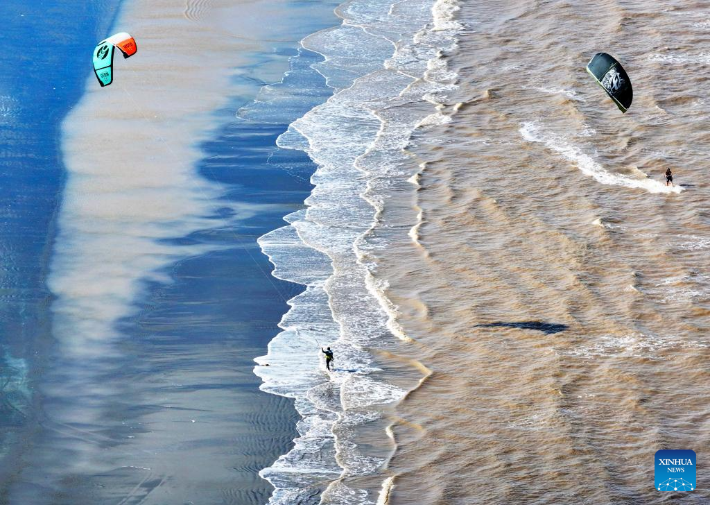 NANTONG, 6 octubre, 2024 (Xinhua) -- Vista aérea tomada con un dron el 4 de octubre de 2024 de turistas practicando kitesurf en una playa en Qidong, ciudad de Nantong, en la provincia de Jiangsu, en el este de China. Durante la semana de vacaciones con motivo del Día Nacional que comienza el 1 de octubre, los chinos se toman un descanso para viajar y disfrutar de actividades de ocio. La creciente y fuerte demanda de las personas por opciones de vacaciones diversificadas ha dado lugar a productos culturales y turísticos más abundantes y diversos en el mercado turístico durante las vacaciones. (Xinhua/Xu Congjun)