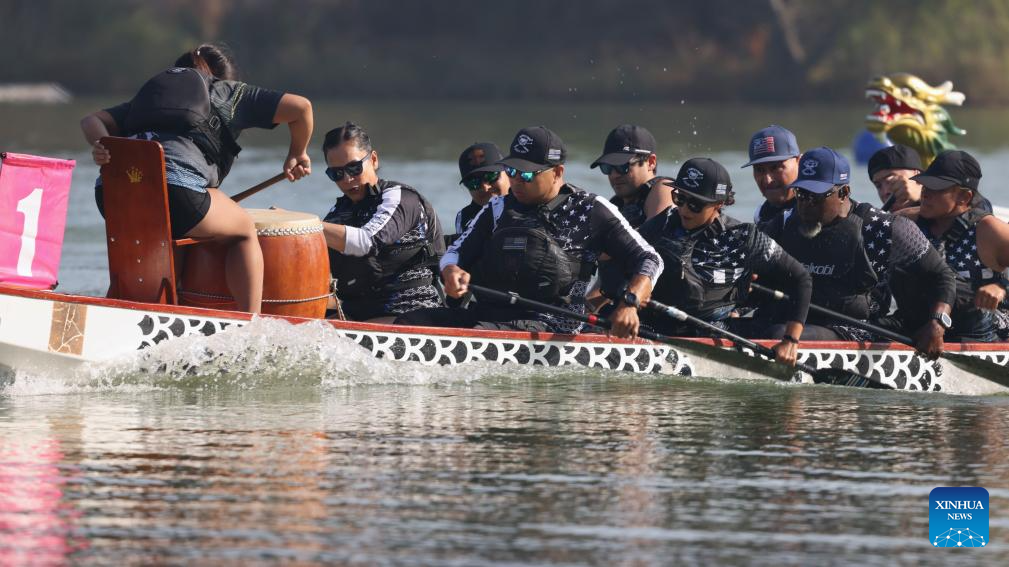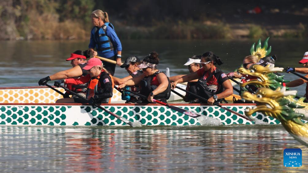 LOS ÁNGELES, 6 octubre, 2024 (Xinhua) -- Imagen del 5 de octubre de 2024 de personas participando en el Festival del Bote de Dragón de Los Ángeles, en Los Ángeles, California, Estados Unidos. Más de cien equipos alrededor de Estados Unidos participaron en las carreras de bote de dragón anuales. (Xinhua/Qiu Chen)