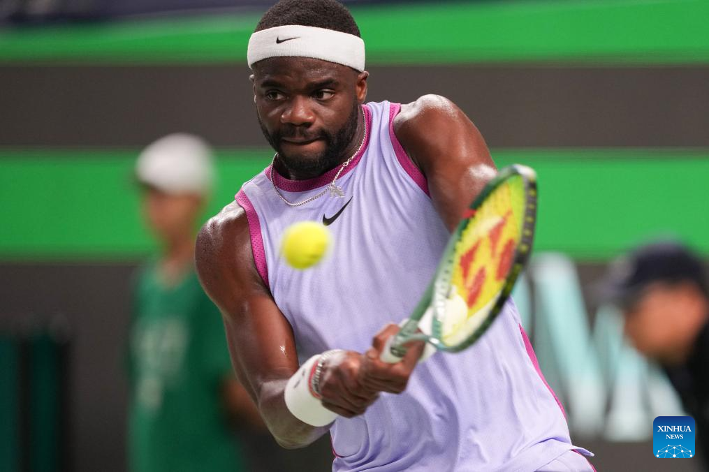 SHANGHAI, 7 octubre, 2024 (Xinhua) -- Frances Tiafoe, de Estados Unidos, devuelve la pelota durante el partido de octavos de final de individuales masculinos ante Zhou Yi, de China, en el torneo de tenis Masters de Shanghai en el ATP World Tour, en Shanghai, en el este de China, el 7 de octubre de 2024. (Xinhua/Xu Yanan)