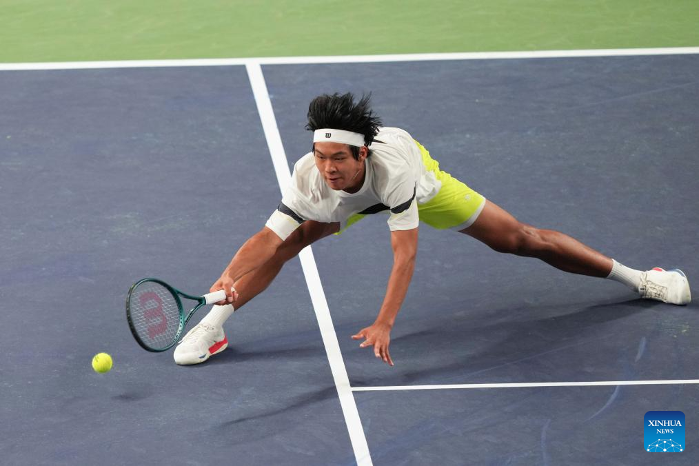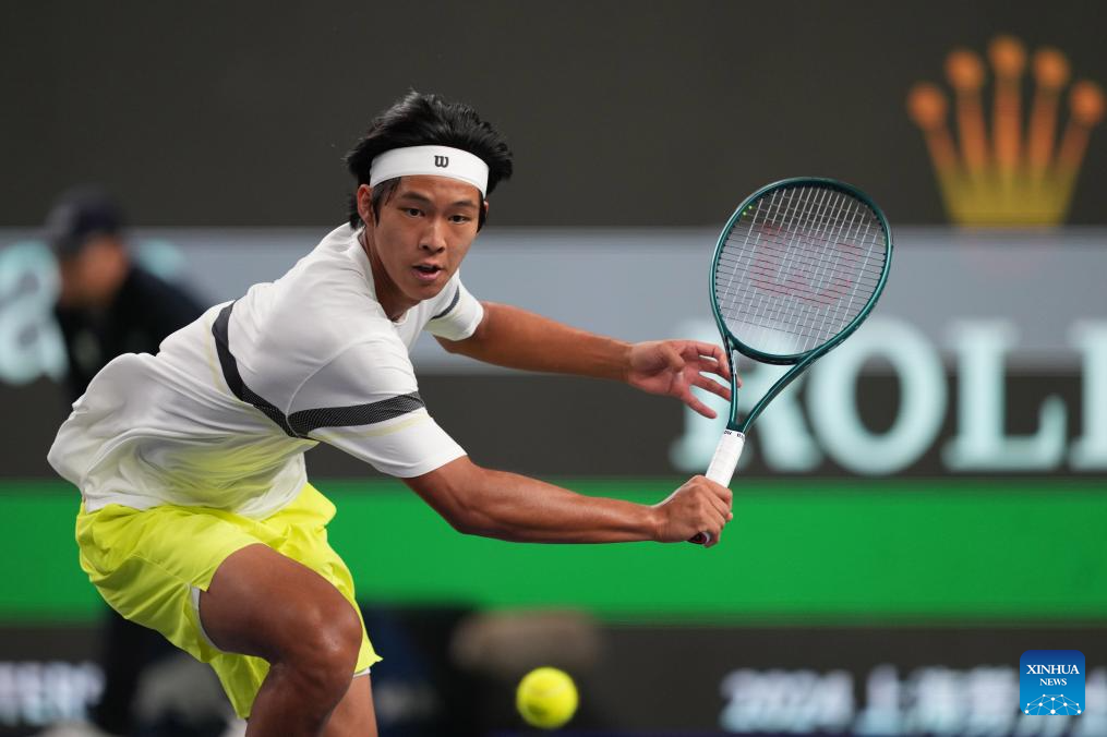 SHANGHAI, 7 octubre, 2024 (Xinhua) -- Zhou Yi, de China, devuelve la pelota durante el partido de octavos de final de individuales masculinos ante Frances Tiafoe, de Estados Unidos, en el torneo de tenis Masters de Shanghai en el ATP World Tour, en Shanghai, en el este de China, el 7 de octubre de 2024. (Xinhua/Xu Yanan)