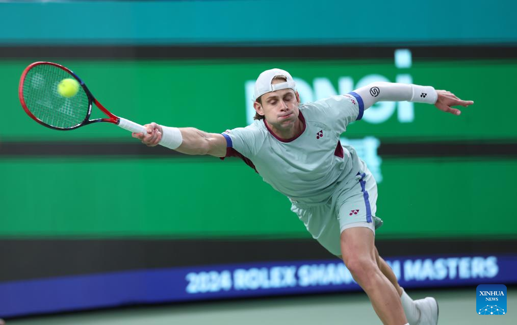 SHANGHAI, 7 octubre, 2024 (Xinhua) -- Zizou Bergs, de Bélgica, devuelve la pelota durante el partido de octavos de final de individuales masculinos ante Grigor Dimitrov, de Bulgaria, en el torneo de tenis Masters de Shanghai en el ATP World Tour, en Shanghai, en el este de China, el 7 de octubre de 2024. (Xinhua/Bai Xuefei)