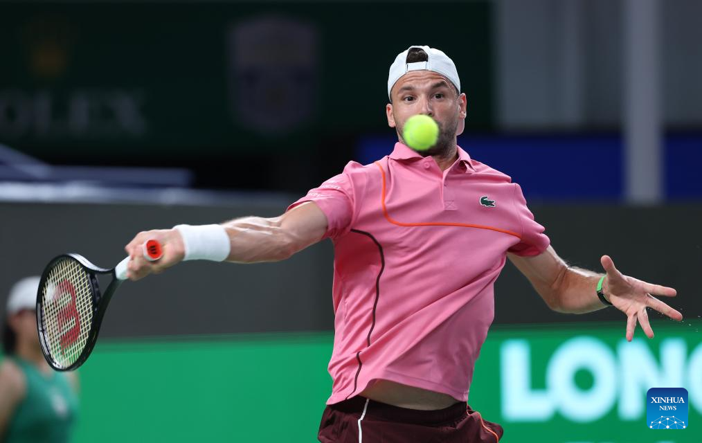 SHANGHAI, 7 octubre, 2024 (Xinhua) -- Grigor Dimitrov, de Bulgaria, devuelve la pelota durante el partido de octavos de final de individuales masculinos ante Zizou Bergs, de Bélgica, en el torneo de tenis Masters de Shanghai en el ATP World Tour, en Shanghai, en el este de China, el 7 de octubre de 2024. (Xinhua/Bai Xuefei)
