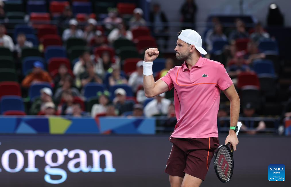 SHANGHAI, 7 octubre, 2024 (Xinhua) -- Grigor Dimitrov, de Bulgaria, festeja después de ganar el partido de octavos de final de individuales masculinos ante Zizou Bergs, de Bélgica, en el torneo de tenis Masters de Shanghai en el ATP World Tour, en Shanghai, en el este de China, el 7 de octubre de 2024. (Xinhua/Bai Xuefei)