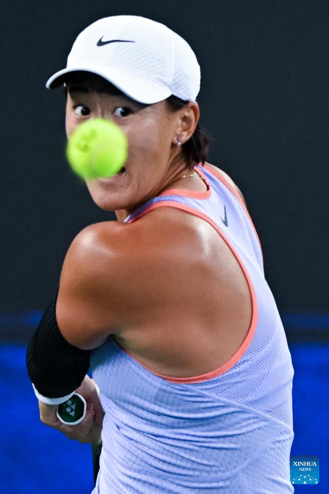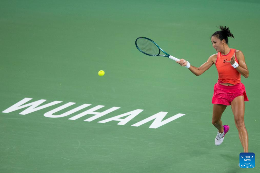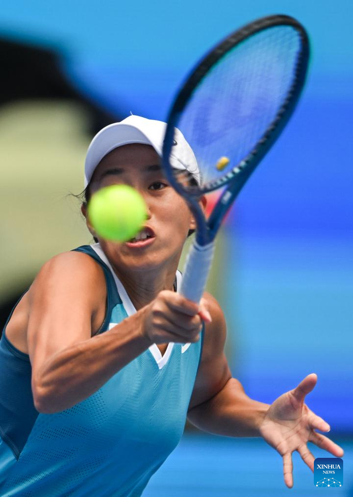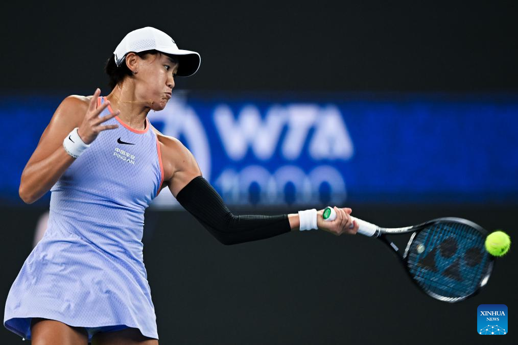 WUHAN, 8 octubre, 2024 (Xinhua) -- Zhang Shuai, de China, devuelve la pelota durante el partido de la ronda de 32avos de final de individuales femeninos ante Yulia Putintseva, de Kazajistán, en el torneo de tenis Abierto de Wuhan 2024, en Wuhan, capital de la provincia de Hubei, en el centro de China, el 8 de octubre de 2024. (Xinhua/Du Zixuan)