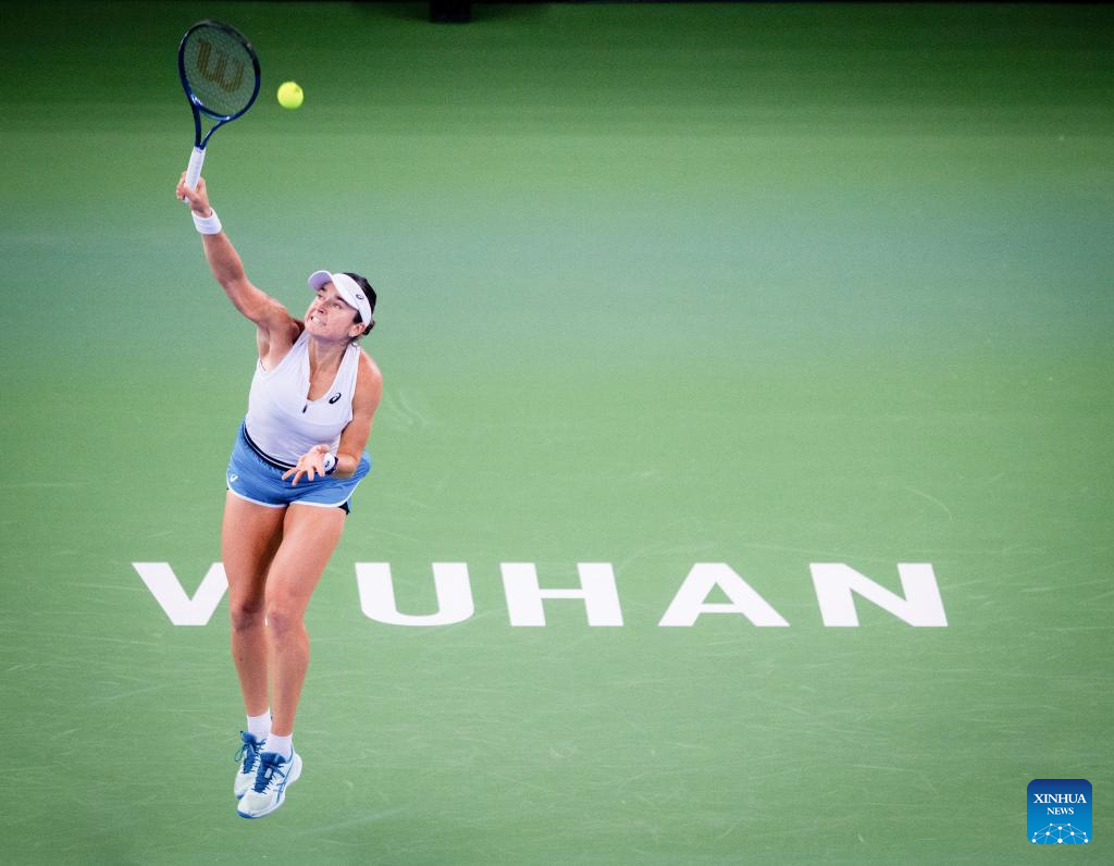 WUHAN, 7 octubre, 2024 (Xinhua) -- Caroline Dolehide, de Estados Unidos, sirve la pelota durante el partido de octavos de final de individuales ante Wang Xinyu, de China, en el torneo de tenis Abierto de Wuhan de la WTA 2024, en Wuhan, capital de la provincia de Hubei, en el centro de China, el 7 de octubre de 2024. (Xinhua/Hu Jingwen)