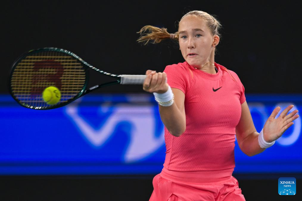 WUHAN, 8 octubre, 2024 (Xinhua) -- Andreeva Mirra, de Rusia, devuelve la pelota durante el partido de la ronda de 32avos de final de individuales femeninos ante Wang Xiyu, de China, en el torneo de tenis Abierto de Wuhan 2024, en Wuhan, capital de la provincia de Hubei, en el centro de China, el 8 de octubre de 2024. (Xinhua/Du Zixuan)