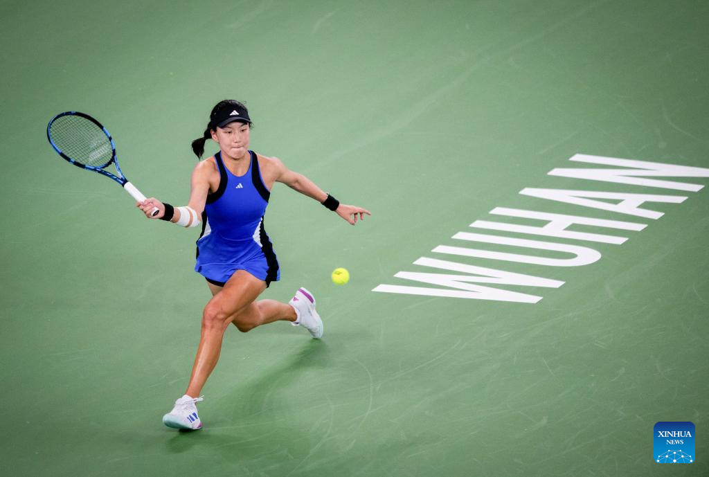 WUHAN, 7 octubre, 2024 (Xinhua) -- Wang Xinyu, de China, devuelve la pelota durante el partido de octavos de final de individuales ante Caroline Dolehide, de Estados Unidos, en el torneo de tenis Abierto de Wuhan de la WTA 2024, en Wuhan, capital de la provincia de Hubei, en el centro de China, el 7 de octubre de 2024. (Xinhua/Hu Jingwen)