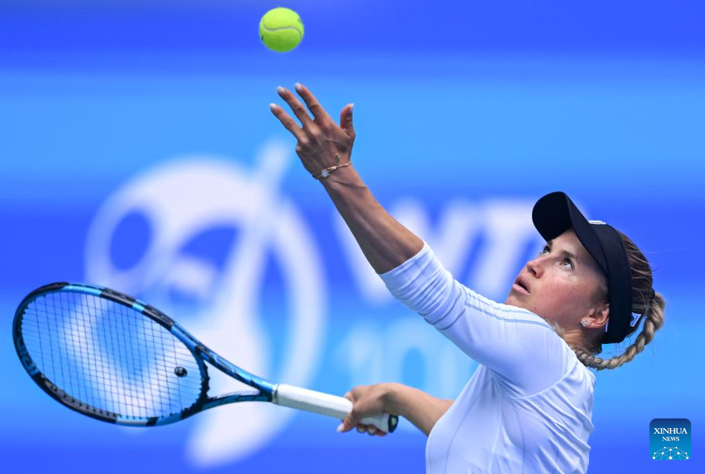 WUHAN, 8 octubre, 2024 (Xinhua) -- Yulia Putintseva, de Kazajistán, sirve la pelota durante el partido de la ronda de 32avos de final de individuales femeninos ante Zhang Shuai, de China, en el torneo de tenis Abierto de Wuhan 2024, en Wuhan, capital de la provincia de Hubei, en el centro de China, el 8 de octubre de 2024. (Xinhua/Du Zixuan)
