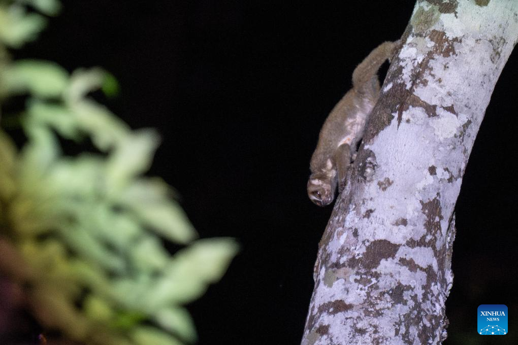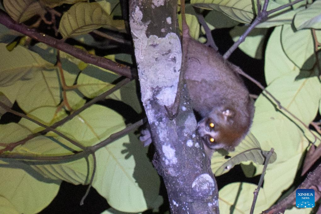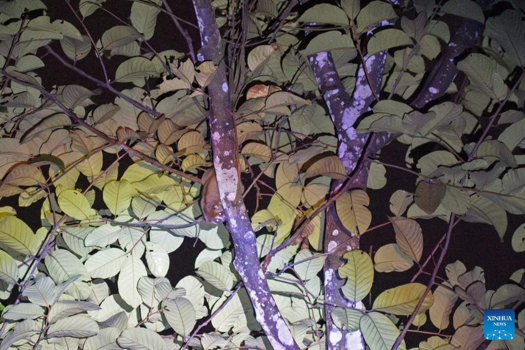 SINGAPUR, 8 octubre, 2024 (Xinhua) -- Imagen del 7 de octubre de 2024 un loris lento de la Sonda salvaje visto en el bosque de la Reserva Natural de la Cuenca Central, en Singapur. (Xinhua/Then Chih Wey)