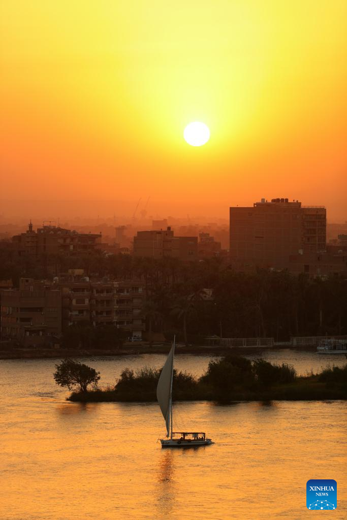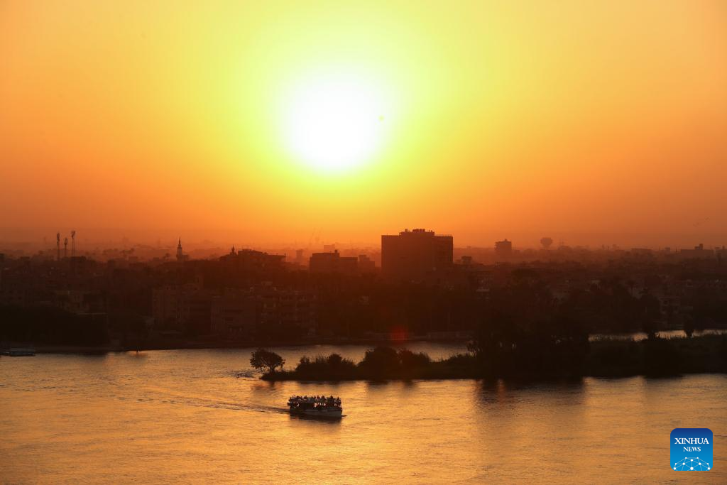 EL CAIRO, 8 octubre, 2024 (Xinhua) -- Un barco navega por el río Nilo al atardecer, en El Cairo, Egipto, el 8 de octubre de 2024. (Xinhua/Sui Xiankai)