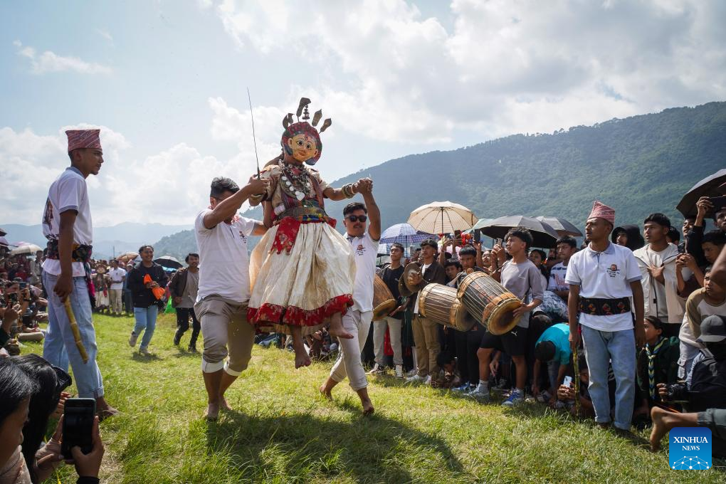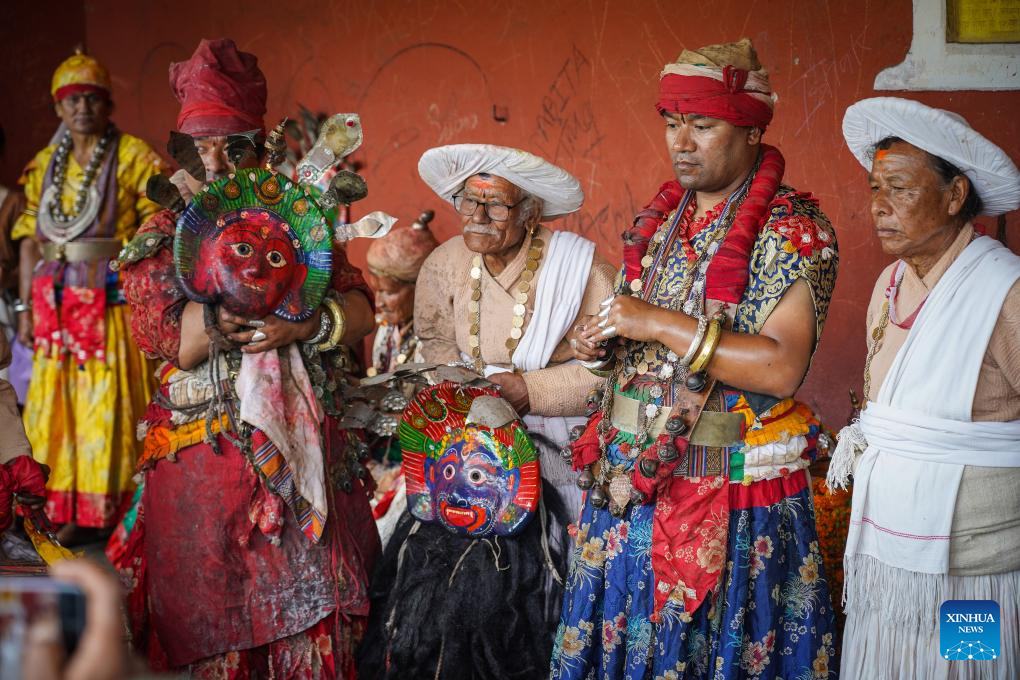 LALITPUR, 8 octubre, 2024 (Xinhua) -- Artistas se preparan para realizar una danza de máscaras durante la celebración del festival de Rudrayani, ampliamente conocido como Sikali Jatra, en la aldea de Khokana de Lalitpur, Nepal, el 8 de octubre de 2024. (Xinhua/Hari Maharjan)